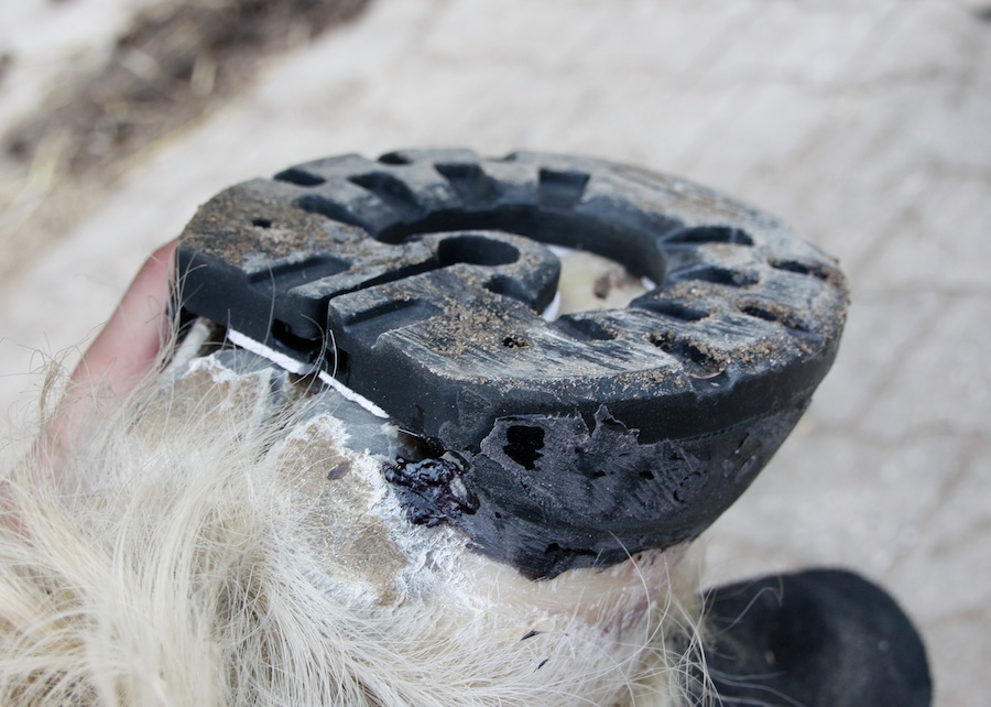 Der Schlitz im Steg der Performance hatte sich nach ein paar Wochen bereits sichtlich geweitet. So konnte der Huf auf natürliche Weise im unteren Bereich in die Breite wachsen. Dies wäre unter einem herkömmlichen, festen Hufschutz nur erschwert möglich gewesen und hätte wahrscheinlich den Huf ehr eingeengt.