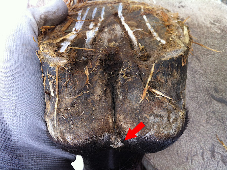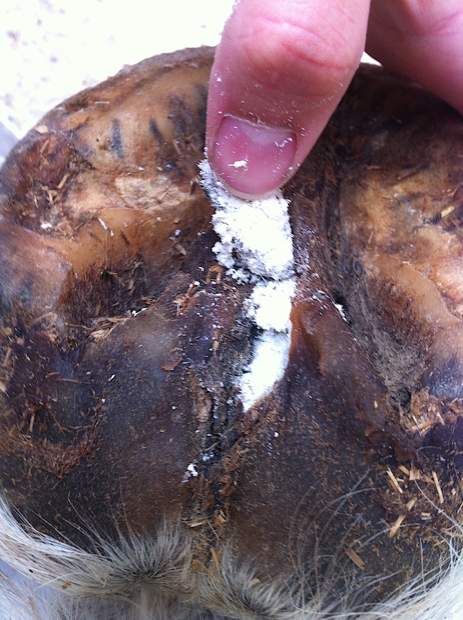 Ein leider häufig gefundenes Bild ist eine sehr tiefe, bis in oder zumindest an den Ballen reichende mittlere Strahlfurche. Versucht man dazwischen mit dem Hufauskratzer zu reinigen kann es gut sein, dass das Pferd zuckt und den Huf wegreißt, denn hier hat sich der Pilz bis an die inneren Strukturen des Hufes gefressen. DAS TUT WEH!