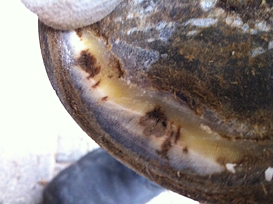 Ein leider häufig gefundenes Bild ist eine sehr tiefe, bis in oder zumindest an den Ballen reichende mittlere Strahlfurche. Versucht man dazwischen mit dem Hufauskratzer zu reinigen kann es gut sein, dass das Pferd zuckt und den Huf wegreißt, denn hier hat sich der Pilz bis an die inneren Strukturen des Hufes gefressen. DAS TUT WEH!